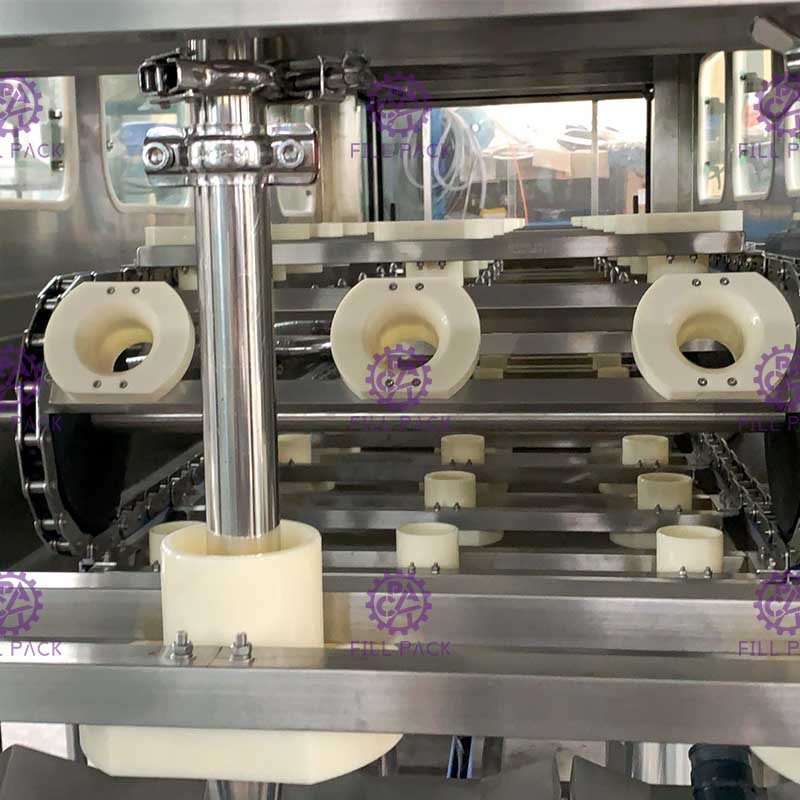After the filling is completed, the full barrel is sent to the capping station by the conveyor belt, and the bottle cap is automatically put on the barrel mouth when passing the capping station on the way. After the capping is completed, it is output through the conveyor chain and enters the post-packaging process.
