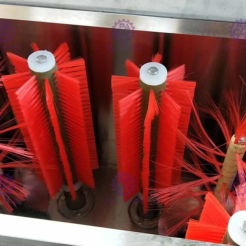 Worker put used jar in right side of de-capper position, with the neck inserting into the hole, worker foot press pedal to release cap off neck; And then worker need to take the jar to insert into left side of the machine-washing position. After the jar putting in, the window need to be closed. Then the washer will be started by itself. During washing, the inner brush inside jar and Washing time is pre-settled, the machine will stop when time finish. Heating function could be switched on/ off as client's needing.