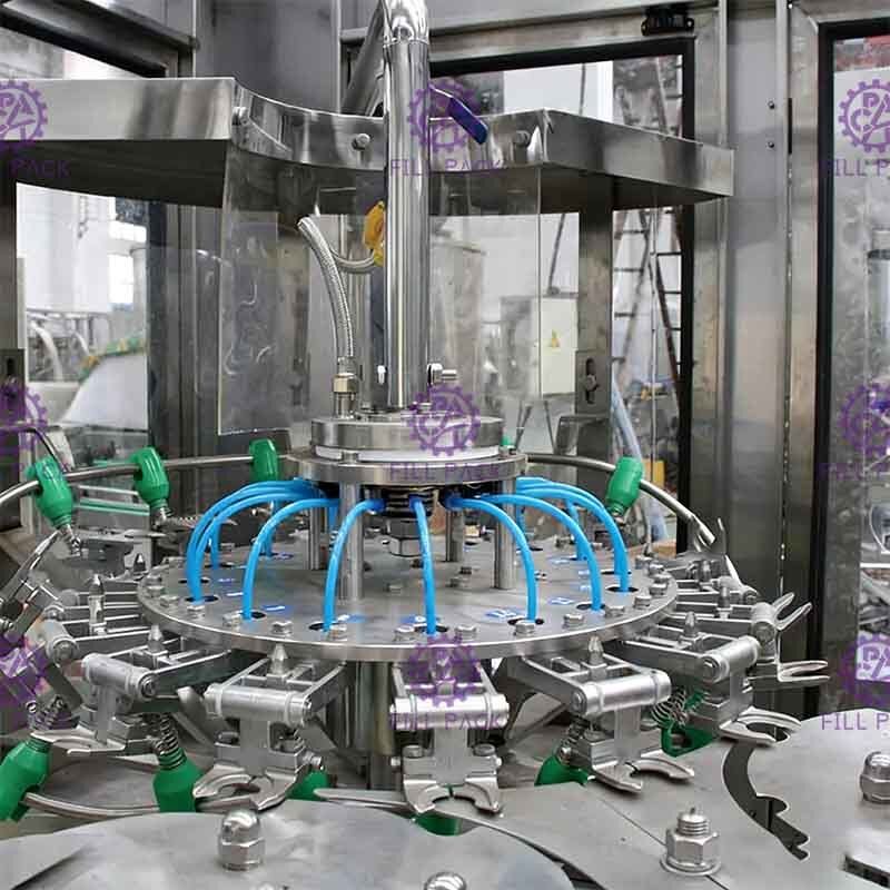 6) The filling valve opens and begins filling when it moves down and touches the bottleneck, the filling valve move up and leave the bottleneck when it finishes filling.
