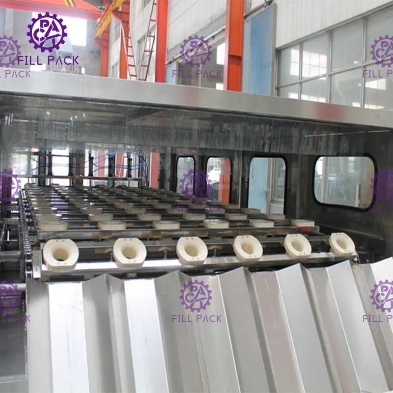 The whole process is combined with 3 machines of different functions in one frame. General control of PLC, several photo electricity and several cylinders; Capacity: 800-900 bottles per hour-5L