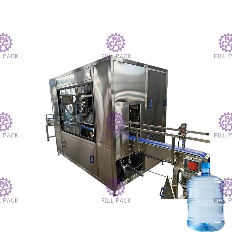 This automatic pre-wash gallon bottle inner-outer brush washing machine is designed for efficient cleaning of 18.9L / 20L 5-gallon bottles. It features rotating outer brushes and inner brushes, working together with alkaline washing solution to achieve thorough cleaning of both the inside and outside of bottles.